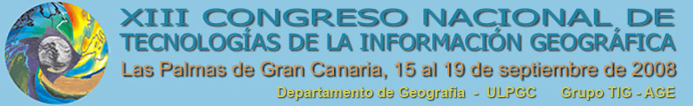 El Grupo de Tecnologías de la Información Geográfica de la AGE, a través del Departamento de Geografía de la Universidad de Las Palmas de Gran Canaria es el encargado de organizar este año el XIII Congreso Nacional de Tecnologías de la Información Geográfica, que bajo el título de “Tecnologías de la Información Geográfica para el Desarrollo Territorial”, se celebrará en la ciudad de Las Palmas de Gran Canaria del 15 al 19 de septiembre de 2008. |
