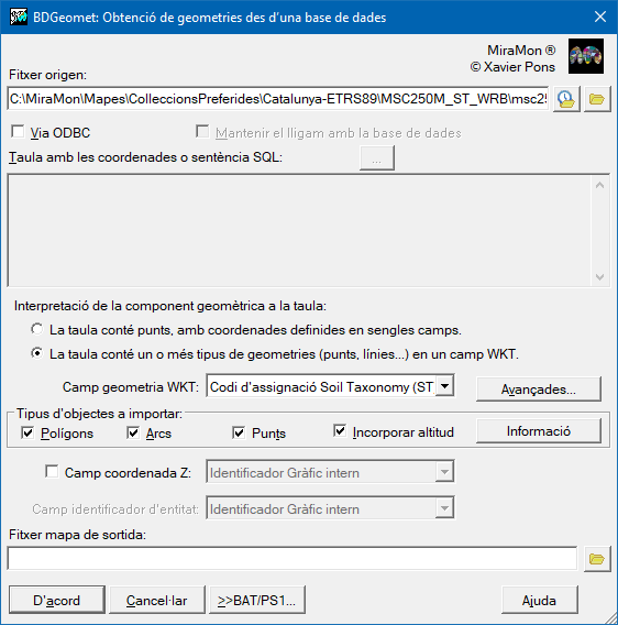 ![]() Obtenció de punts PNT des de taula DBF, Access, etcL'aplicació permet extreure localitzacions geogràfiques de tipus punt (X,Y) a partir de camps d'una taula d'una base de dades qualsevol (local o remota) i crea un fitxer de punts estructurat topològicament en format PNT del MiraMon. Per a més informació en relació al funcionament del programa, la sintaxi, etc, es pot consultar BDGeomet: Obtenció de punts PNT des d'una base de dades (local o remota).