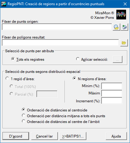 ![]() Regions a partir d'ocurrències puntualsL'aplicació genera una capa vectorial de polígons a partir de l'agrupació temàtica i espacial de punts. Típicament s'usa en la determinació de regions d'activitat, influència, presència, etc, d'una determinada espècie biològica o variable a partir de mostres captades en localitzacions puntuals.