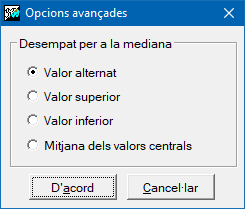 En els càlculs de quantils, com la mediana, es pot indicar, amb el modificador /MEDIANA_EMPAT=, el tipus de desempat a usar per al seu càlcul quan la posició del quantil sigui entre dos valors de la sèrie. Per a més informació es pot consultar sintaxi general.