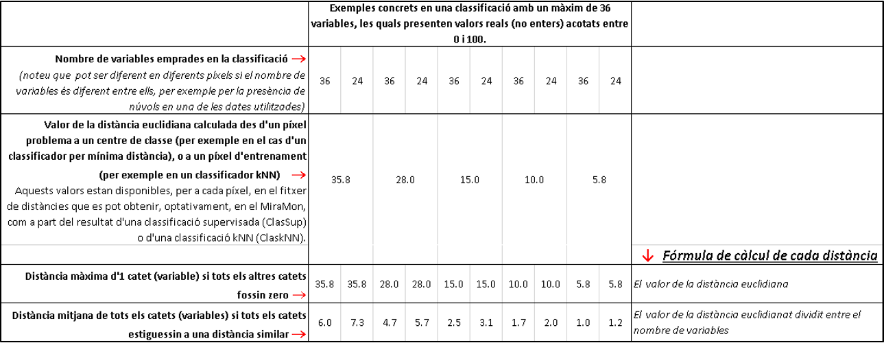 Aquestes distàncies per a la categoria "guanyadora" es poden obtenir, en cada píxel, en el fitxer de distàncies que proporcionen algunes aplicacions de classificació digital d'imatges del MiraMon. La taula següent mostra com interpretar diversos valors d'aquestes distàncies; en tots els casos es tracta d'un a classificació amb 36 variables i en la qual en alguns píxels en comptes de fer-se la classificació amb 36 variables s'ha hagut de fer amb 24 variables (per exemple perquè en alguna de les diferents dates utilitzades per a la classificació, en aquells píxels hi havia núvols). A més, les variables presenten valors reals (no enters) acotats entre 0 i 100; un exemple d'aquesta transformació seria que els píxels d'una variable que és un índex de vegetació de diferència normalitzada, NDVI, típicament, entre -1 i 1, s'han transformat (multiplicant-los per 50 i sumant-los 50) per tal que els seus valors estiguin entre 0 i 100; un segon exemple seria que bandes de reflectància, típicament entre 0 i 1, s'han convertit en valors entre 0 i 100 (multiplicant-los per 100 i esdevenint percentatges de reflectància).