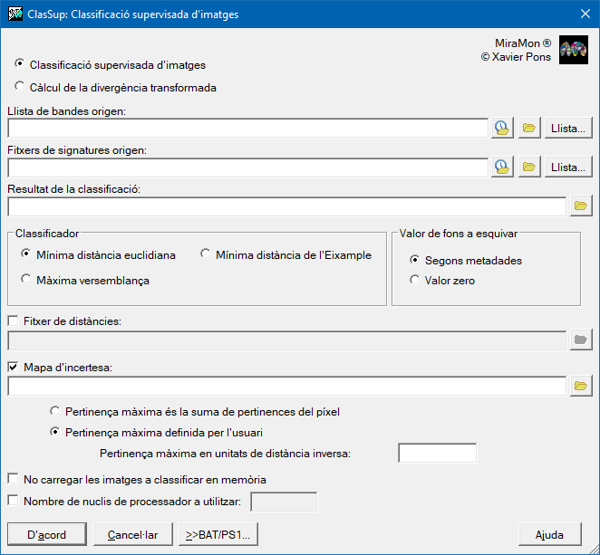 Addicionalment, l'aplicació permet el càlcul de la Divergència Transformada (DT), que en comptes de fer una classificació escriu en un fitxer els valors de les matrius de covariància i de correlacions per a cada classe, així com la DT entre totes les signatures (classes) proporcionades. Segons Swain (1973), quan DT=2 la probabilitat de separació entre classes assoleix valors > 90 %.