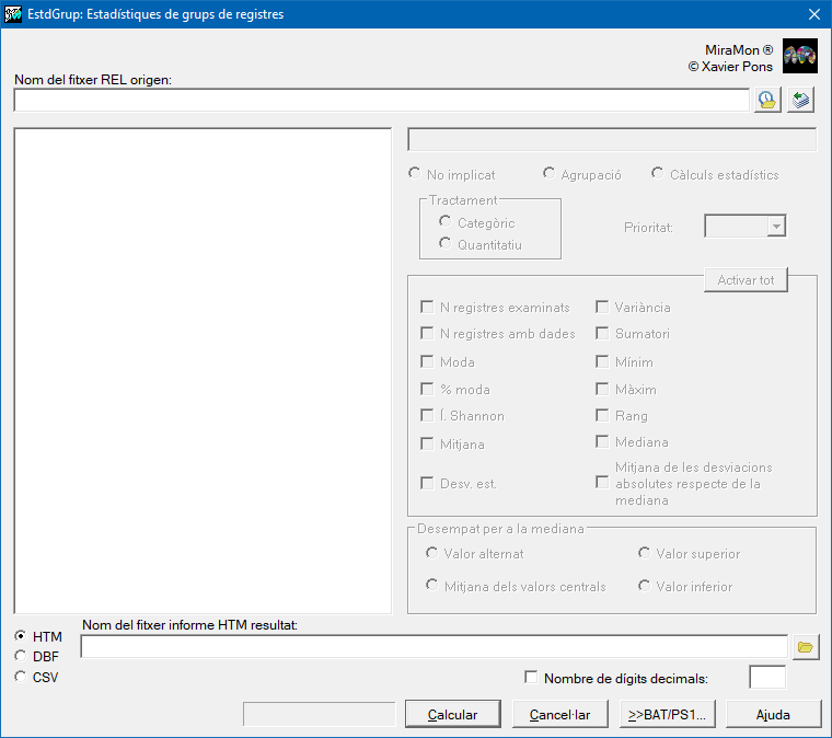 Paràmetre d'entrada): Fitxer REL corresponent a la base de dades d'una capa vectorial estructurada, o taula DBF, a partir de la qual es realitzaran els càlculs estadístics seleccionats.