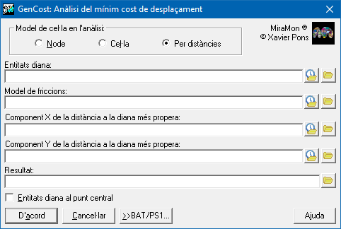 L'algorisme de cerca de mínim cost acumulat és una versió pròpia del MiraMon de l'Algorisme de Dijkstra (Dijkstra, 1959). El model de friccions és, en aquest cas, un ràster en què el valor de cada cel·la indica la seva dificultat de pas (fricció). Així, cel·les amb valors de fricció elevats ofereixen més resistència de pas que d'altres amb valors inferiors. El ràster de dianes especifica les cel·les a partir de les quals es calculen els costos mínims. En altres paraules, cada cel·la no-diana contindrà, en el resultat, el mínim cost per arribar a una cel·la diana. Aquestes cel·les diana tenen assignat qualsevol valor diferent del sensedades. En una anàlisi de costos en què es modelitza la continentalitat, les entitats diana correspondran a la rasterització de tot l'àmbit del mar. El cost es defineix a partir del producte entre el valor de fricció (que en aquesta aplicació no pot ser negatiu) i la distància recorreguda amb aquest valor. Així, un model de friccions constant de valor igual a 1 a totes les cel·les, donaria un ràster resultat amb la distància de cada cel·la a la diana més propera. En aquest cas, l'aplicació GenCost és similar l'aplicació BufDist.
