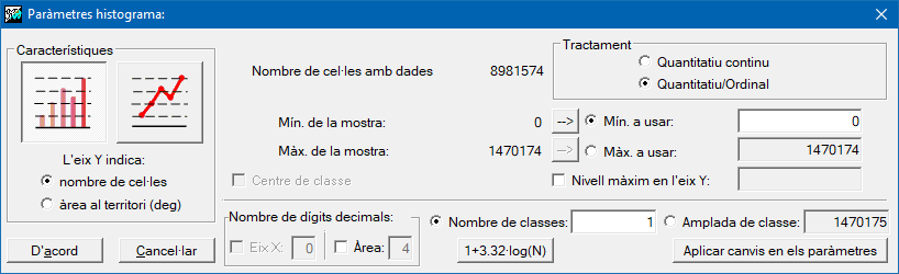 L'apartat Tractament té un aspecte i funcionalitat diferent segons si les dades són quantitatives o ordinals, o categòriques. En el primer cas permet definir les classes en valors reals quan se selecciona "Quantitatiu continu", o en enters (llevat que les dades ja siguin reals) quan se selecciona "Quantitatiu/ordinal". En el segon cas (ràsters categòrics) l'únic tractament possible de les dades és "Categòric".