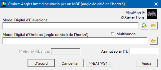 Si el MDE és un ràster multibanda, amb diferents costats de píxel per a cada banda, cal usar el paràmetre /MULTIBANDA per tal de generar com a resultat un ràster multibanda amb els corresponents models d'ombra. Cal tenir en compte que la posició solar es considera única per a totes les bandes, i que si els àmbits fossin excessivament allunyats caldria fer una execució banda a banda amb la posició solar corresponent al centre de l'àmbit.