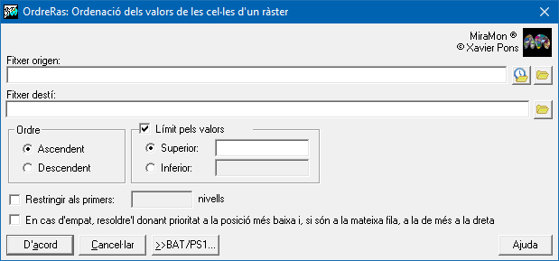 També és possible indicar un valor límit que defineixi el llindar màxim o mínim a considerar. Depenent de si el límit és superior o inferior, s'ordenarà fins o des del valor límit, sempre incloent el propi límit en l'ordenació. Les cel·les que tinguin un valor que sobrepassi aquest llindar, es classificaran com a valors sensedades. Si el ràster original contenia valors sensedades i es vol diferenciar-los dels valors sensedades generats per aquesta aplicació, cal reclassificar amb CalcImg els sensedades resultants a un valor adequat i multiplicar el resultat de la reclassificació per una màscara obtinguda del ràster original on la zona amb dades tingui valor 1 i la resta el valor sensedades.