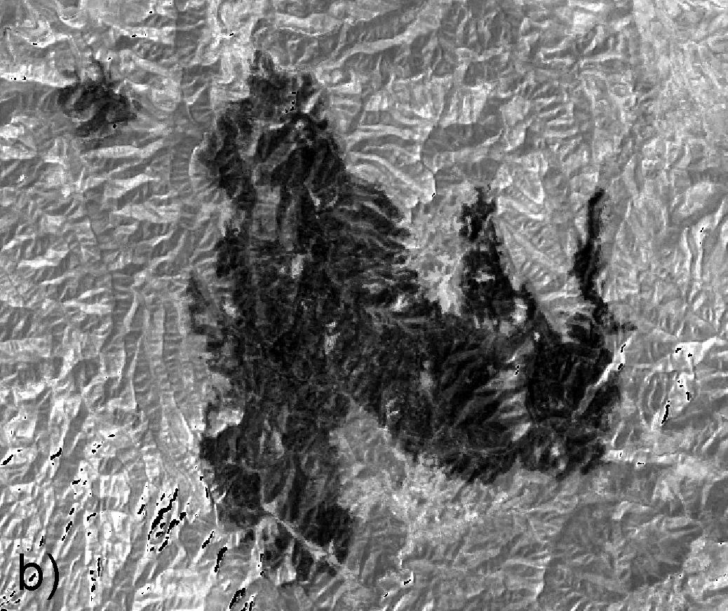 | RGB combination of Landsat-5 (a) compared to the ACP component 1 (b) made with that image. The Component 1 showed the presence of the burned area. |