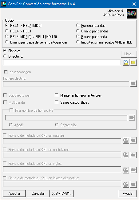 ![]() Conversión de capas entre formatos 1 y 4 de MiraMonLa aplicación permite transformar las relaciones entre tablas, los metadatos y la simbolización a la versión 4/5 desde versiones anteriores. También permite el retorno a versiones anteriores con características limitadas. Para más información en relación al funcionamiento del programa, la sintaxis, etc, se puede consultar ConvREL: Conversión de capas entre formatos 1 y 4 de MiraMon.