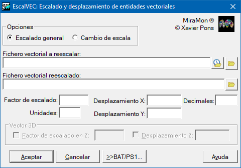 ![]() ![]() ![]() Escalado y desplazamiento de vectoresLa aplicación permite el cambio de escala de ficheros vectoriales en formato VEC. También permite cambiar coordenadas mapa a coordenadas papel como paso anterior a la exportación hacia algunos paquetes de dibujo. Para más información en relación al funcionamiento del programa, la sintaxis, etc, se puede consultar EscalVEC: Escalado y desplazamiento de entidades vectoriales.