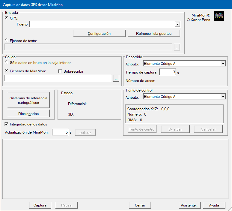 Captura de datos GPS en tiempo realLa aplicación permite capturar los datos transmitidos por un GPS y los convierte a un fichero de líneas que se representa a tiempo real sobre la cartografía (ortofoto, mapas topográficos, etc). MiraMon posiciona la vista adecuadamente en función de la posición y del momento de la estación (map moving) y muestra, en todo momento, información del estado del seguimiento GPS. Para más información en relación al funcionamiento del programa, la sintaxis, etc, se puede consultar GPSMM: Captura de datos GPS en tiempo real.