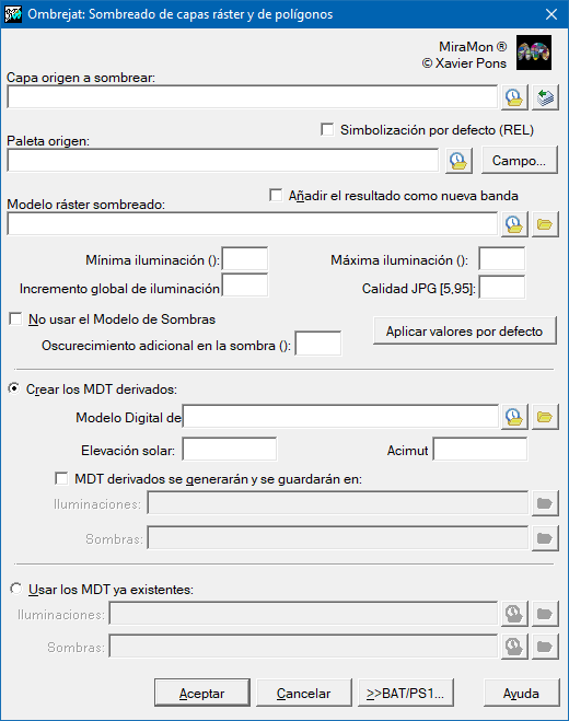 Para más información en relación al funcionamiento del programa, la sintaxis, etc, se puede consultar Ombrejat: Sombreado de capas ráster y de polígonos.