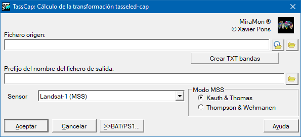 ![]() Transformación tasseled-capLa aplicación permite obtener nuevas bandas por transformación lineal de las originales. Estas nuevas bandas obtenidas tienen un significado físico concreto: el SBI recoge los cambios en la reflectividad total de la escena; el GVI indica el contraste entre las bandas visibles e infrarrojo cercano, relacionado con la actividad de la vegetación; el YVI se relaciona con la cantidad de agua de la vegetación y del suelo, por lo que se le suele llamar también índice de humedad (wetness) o índice de madurez (maturity), ya que se ha hallado una clara relación entre este y la madurez de la cubierta vegetal (edad, densidad de la cobertura, etc.); finalmente, el NSI es sensitivo a la absorción de vapor de agua, aunque fundamentalmente contiene ruido. Para más información en relación al funcionamiento del programa, la sintaxis, etc, se puede consultar TassCap: Transformación tasseled-cap.