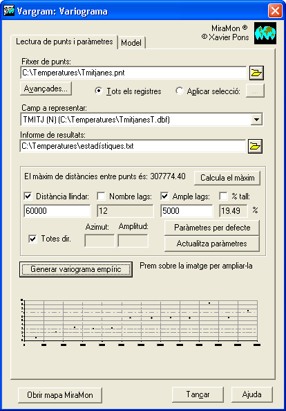 ![]() Representación y modelización del variogramaLa aplicación permite presentar y modelizar el llamado semivariograma, patrón espacial que describe la correspondencia entre la semivariancia y la distancia. La semivariancia, mitad de la varianza, constituye una medida de la dispersión de la variable respecto a su valor esperado y se calcula como la suma de los cuadrados de las desviaciones respecto a la media. El semivariograma (o variograma de forma más general y conceptualmente equivalentes) permite analizar el comportamiento espacial de una propiedad o variable sobre la zona de estudio y su modelización constituye un elemento clave dentro del proceso de interpolación geoestadística (kriging). Para más información en relación al funcionamiento del programa, la sintaxis, etc, se puede consultar Vargram: Representación y modelización del variograma.