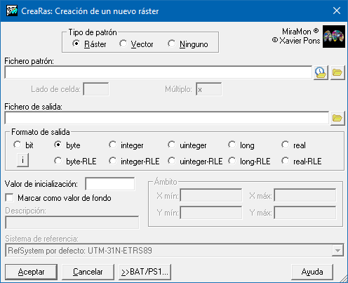Esta aplicación permite crear un nuevo ráster (o un grid dentro de un VEC) a partir de las coordenadas y resolución de celda dadas en un fichero patrón. Este fichero puede ser de tipo IMG, VEC, POL, ARC, PNT o NOD. También se permite entrar estos datos manualmente sin necesidad de un fichero patrón.