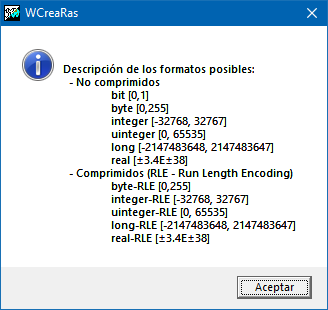 Parámetro de entrada): Se indica el tipo de dato de la nueva imagen. Puede ser cualquiera de los tipos soportados por MiraMon, por ejemplo "byte", "integer-RLE", etc.