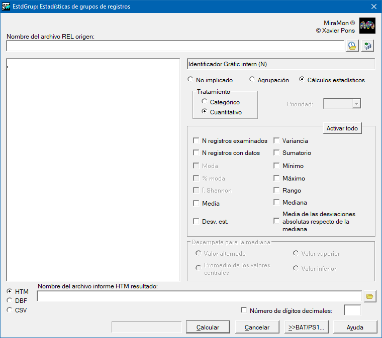 /GRP_#= (Campo Agrupador #) Nombre del campo que actúa como agrupador con orden de prioridad #. El valor de esta variable contendrá un texto alfanumérico construido a partir del nombre del campo y sus relaciones desde la tabla principal. Se pueden usar N campos agrupadores (GRP_#), donde # es el número del campo agrupador (GRP_1, GRP_2,...). El orden de prioridad empieza por el valor 1, que indica el nivel de agrupación más general. Más consideraciones en sintaxis general. (Parámetro de entrada) /ESTD_#= (Campo estadísticas #) Nombre del campo sobre el que se realizan diferentes cálculos estadísticos identificados por el índice #, que solo tiene el significado de orden en que se muestran los diferentes campos calculados. Se pueden calcular estadísticos sobre N campos (ESTD_#). Su valor se constituye de la misma manera que /GRP_#. (Parámetro de entrada) /CAT_# (Tratamiento categórico) Indica tratamiento categórico del campo identificado por /ESTD_#. (Parámetro de entrada) /NUM_# (Tratamiento cuantitativo) Indica tratamiento cuantitativo del campo identificado por /ESTD_#. (Parámetro de entrada) /N_REG_TOTALS_# (Registros totales) Para el campo identificado por /ESTD_# se desea conocer cuál es el número de registros totales (incluye registros vacíos, blancos o sindatos). (Parámetro de entrada) /N_REG_DADES_# (Número de registros con datos) Para el campo identificado por /ESTD_# se desea conocer cuál es el número de registros con datos (sin incluir registros vacíos, blancos o sindatos). (Parámetro de entrada) /PRCNT_MODA_# (Porcentaje Moda) Indica que se desea conocer el porcentaje de ocurrencia del valor modal para el campo identificado por /ESTD_# en un tratamiento categórico. (Parámetro de entrada) /MODA_# (Cálculo Moda) Indica que se desea el cálculo de la moda para el campo identificado por /ESTD_# en un tratamiento categórico. (Parámetro de entrada) /I_SHAN_# (Índice de Shannon) Indica que se desea el cálculo del índice de Shannon para el campo identificado por /ESTD_# en un tratamiento categórico. (Parámetro de entrada) /MITJANA_# (Cálculo mediana) Indica que se desea el cálculo de la mediana para el campo identificado por /ESTD_# en un tratamiento cuantitativo. (Parámetro de entrada) /DESV_STD_# (Desviación estándar) Indica que se desea el cálculo de la desviación estándar para el campo identificado por /ESTD_# en un tratamiento cuantitativo. (Parámetro de entrada) /VAR_# (Varianza) Indica que se desea el cálculo de la varianza para el campo identificado por /ESTD_# en un tratamiento cuantitativo. (Parámetro de entrada) /SUMA_# (Sumatorio) Indica que se desea conocer el sumatorio de todos los valores para el campo identificado por /ESTD_# en un tratamiento cuantitativo. (Parámetro de entrada) /MIN_# (Mínimo) Indica que se desea conocer el valor mínimo para el campo identificado por /ESTD_# en un tratamiento cuantitativo, o el primer valor de una ordenación alfabética ascendente en un tratamiento categórico. (Parámetro de entrada) /MAX_# (Màximo) Indica que se desea conocer el valor máximo para el campo identificado por /ESTD_# en un tratamiento cuantitativo, o el último valor de una ordenación alfabética ascendente en un tratamiento categórico. (Parámetro de entrada) /PRCNT_GRUP_# (Número de valores válidos) Indica que se desea conocer el número de valores de un elemento de la proyección en relación al número total de valores para el campo identificado por /ESTD_#. En este cálculo no se consideran los valores sindatos. (Parámetro de entrada) /PRCNT_GRUP_NODATA_# (Número de valores considerando el sindatos) Indica que se desea conocer el porcentaje del valor respecto al número total de valores de la proyección para el campo identificado por /ESTD_#. En este cálculo sí se consideran los valores sindatos. (Parámetro de entrada) /MEDIANA_# (Mediana) Indica que se desea conocer la mediana de todos los valores para el campo identificado por /ESTD_# en un tratamiento cuantitativo. (Parámetro de entrada) /DESV_MEDIANA_# (Media de las desviaciones absolutas respecto de la mediana) Indica que se desea conocer la media de las desviaciones absolutas respecto de la mediana de todos los valores para el campo identificado por /ESTD_# en un tratamiento cuantitativo. (Parámetro de entrada) /MEDIANA_EMPAT_#= (Desempate de la mediana) Si se ha solicitado el cálculo de algún cuantil (como mediana, cuartil o percentil), indica el criterio de desempate a usar para su cálculo. Para saber más sobre los valores de este parámetro se pueden seguir las consideraciones del documento de sintaxis general. (Parámetro de entrada) /N_DECIMALS= (Número de dígitos decimales) Es el número de cifras decimales para los resultados de las estadísticas que corresponden a un valor numérico no-entero. Si no se especifica, se usa el valor definido en el fichero de configuración MiraMon.par. (Parámetro de entrada)