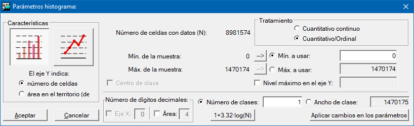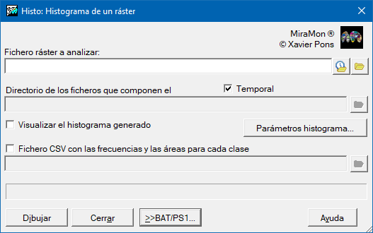 La aplicación Histo de MiraMon permite elaborar el histograma de una imagen ráster, visualizarlo en pantalla y guardar el resultado obtenido en un archivo CSV con las frecuencias y las áreas para cada clase para poder efectuar, si se desea, un análisis más profundo en una hoja de cálculo. La persona usuaria puede definir los parámetros del histograma a obtener: tipo de gráfico (cálculo de frecuencias o cálculo del área ocupada por cada clase), tipo de tratamiento de los datos (cuantitativo continuo, cuantitativo/ordinal, categórico), valor mínimo y máximo que se quiere representar en el histograma, número de clases a representar, etc.