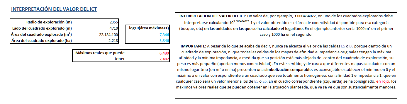 Si se quiere revertir el valor del índice al dato de superficie (ha o en m2, según se haya calculado) de conectividad de cada celda, simplemente se debe efectuar, con la función POW() de la aplicación CalcImg, la operación: capa_superficie=10(capa_ICT)-1.