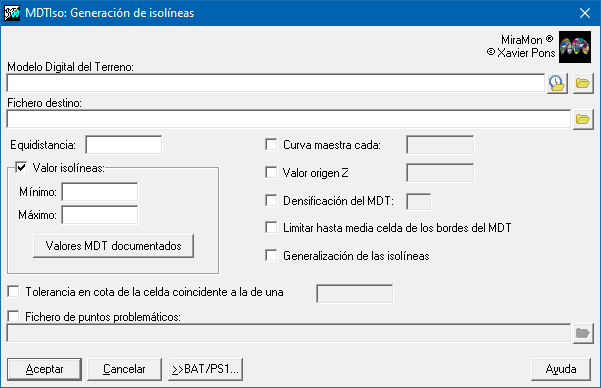 MDTISO C:\FicheroMDT.img C:\FicheroIsolinias.arc 20 /EQUID_MESTRA=100 /ZMIN=128 /ZMAX=763 /ZBASE=100 /DENSIFICACIO=3 /MIGPIXEL /GENERALITZACIO /PROBL=C:\FicheroProbls.pnt MDTISO C:\FicheroMDT.img C:\FicheroIsolinias.arc 20 /EQUID_MESTRA=100 /ZMIN=128 /ZMAX=763 /ZBASE=100 /DENSIFICACIO=3 /GENERALITZACIO /ZINCREM=10 /PROBL=C:\FicheroProbls.pnt