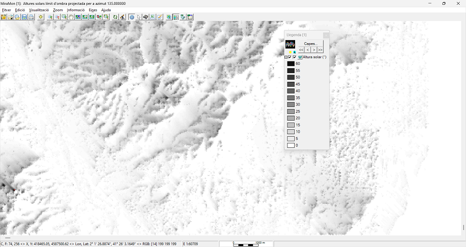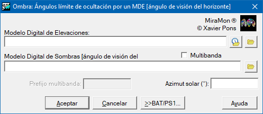 Si el MDE es un ráster multibanda, con diferentes lados de píxel para cada banda, se debe usar el parámetro /MULTIBANDA para generar como resultado un ráster multibanda con los modelos de sombras correspondientes. Se debe tener en cuenta que la posición solar se considera única para todas las bandas, y que si los ámbitos estuvieran excesivamente alejados habría que realizar una ejecución banda a banda con la posición solar correspondiente al centro del ámbito.