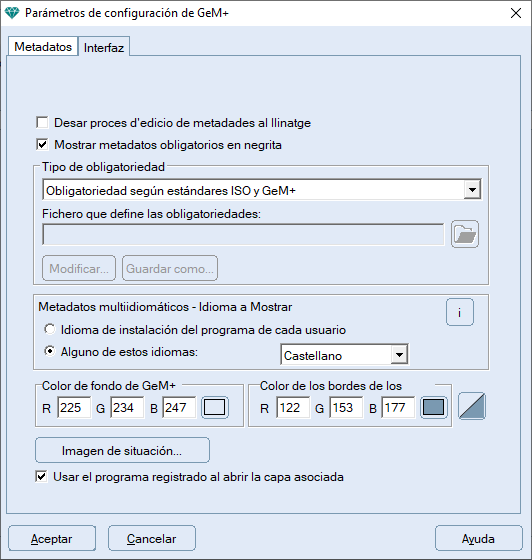 Al acceder a esta configuración se nos presenta una ventana con dos pestañas: Metadatos e Interfaz