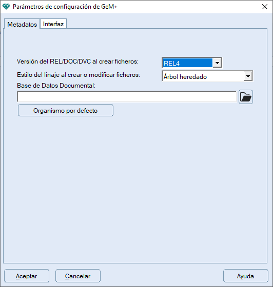 - Versión del REL/DOC/DVC al crear ficheros: Versión que se quiere por defecto en la creación de ficheros de metadatos en formato REL usando el GeM+.