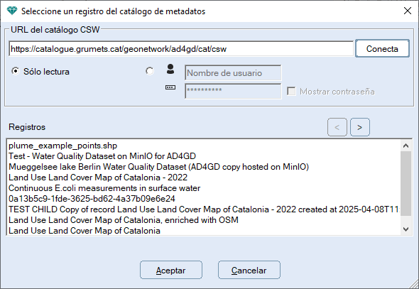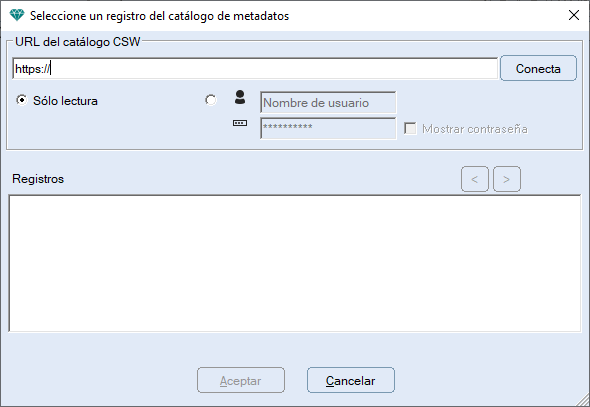 Se debe seleccionar la opción "Solo lectura" si únicamente se desea leer los metadatos o bien no se dispone de un usuario con derechos de modificación y escritura.