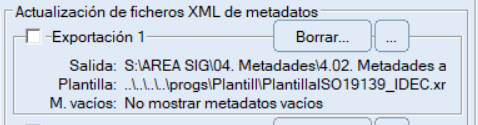 No es necesario generar siempre todas las exportaciones de metadatos definidas de manera automática. La casilla [V] permite decidir cuáles de las exportaciones definidas se generarán en el momento de guardar los metadatos.