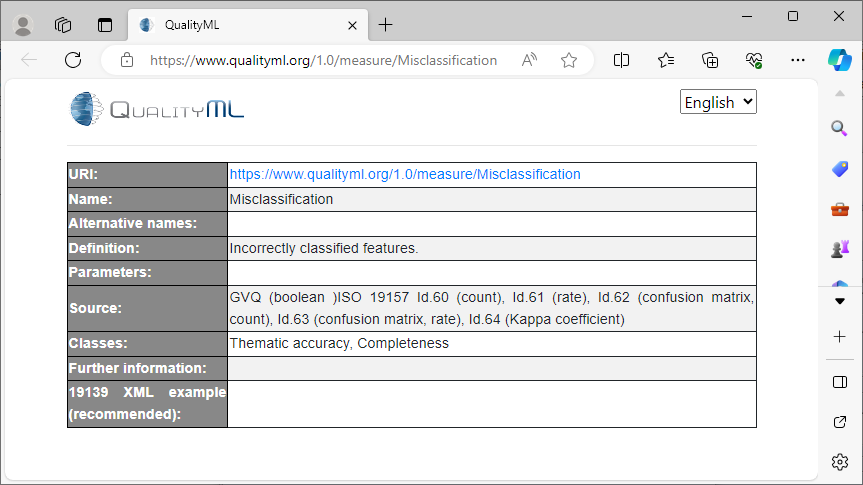 URL de la definición de la métrica en el QualityML (si la métrica es normalizada), nombre y descripción de la métrica.