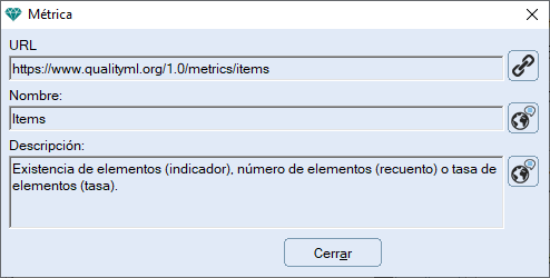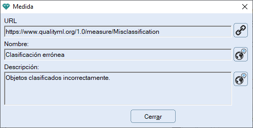 Estos indicadores son los definidos en la ISO y en el QualityML, y podemos consultar su nombre y descripción idiomática a partir del botón