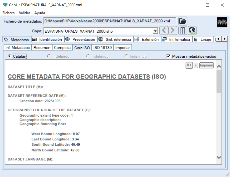 Vista de los elementos de metadatos que forman el Core ISO, con la opción activada Mostrar metadatos vacíos que muestra los elementos de los que no se ha proporcionado información.