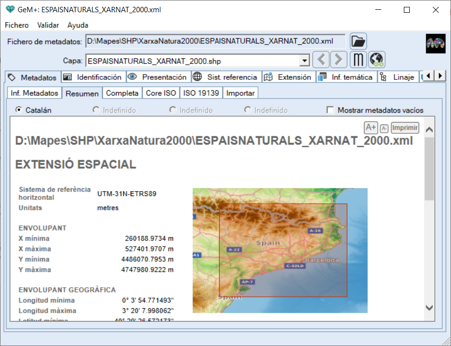 (una versión reducida de MiraMon Professional, limitada a funciones habituales como visualización, consulta o impresión). En la pestaña Resumen se muestra que se ha documentado automáticamente la envolvente geográfica del conjunto de información geográfica, el sistema de referencia espacial correspondiente, la fecha de creación de la capa y se ha creado información sobre el conjunto de información geográfica según el modelo de datos y metadatos.