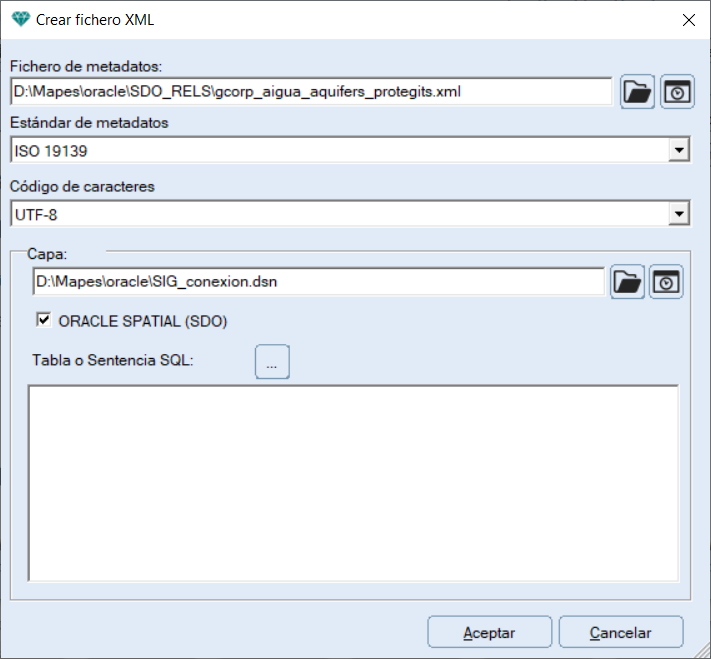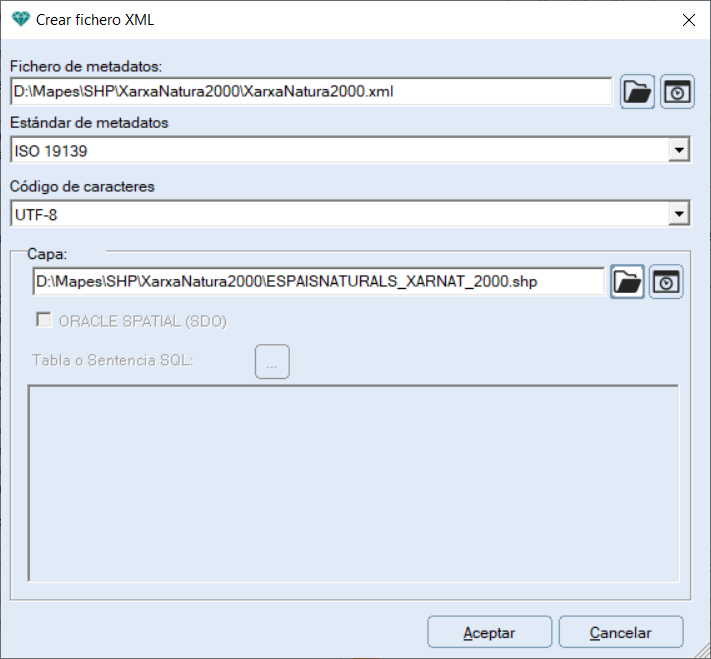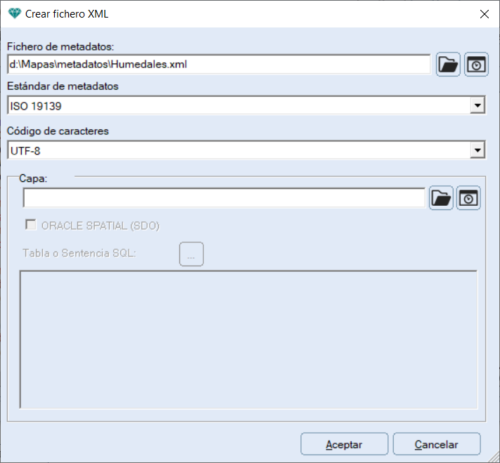Los ficheros XML pueden ser creados desde cero introduciendo todos los metadatos manualmente, pero si se dispone de acceso a la base cartográfica indicada en Capa y esta está en formato TIFF, ASCII, Shape o se trata de datos vectoriales de una base geoespacial Oracle SDO, se establecerá la conexión con los datos y se incorporarán diversos metadatos de manera automática.