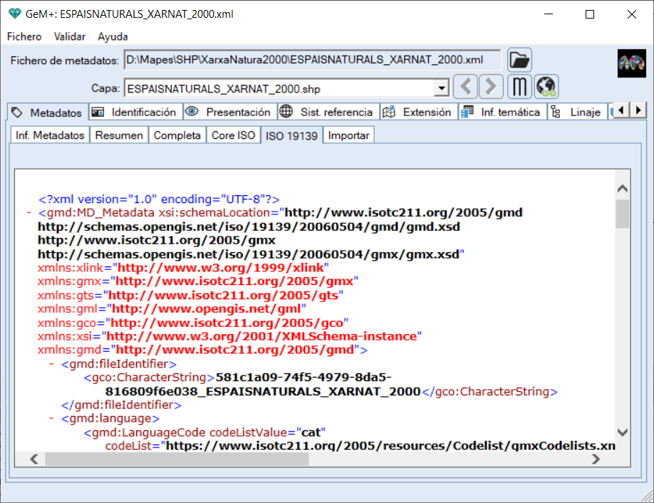 La siguiente pestaña permite visualizar los elementos de metadatos en XML según el estándar ISO 19139:2007.