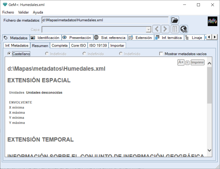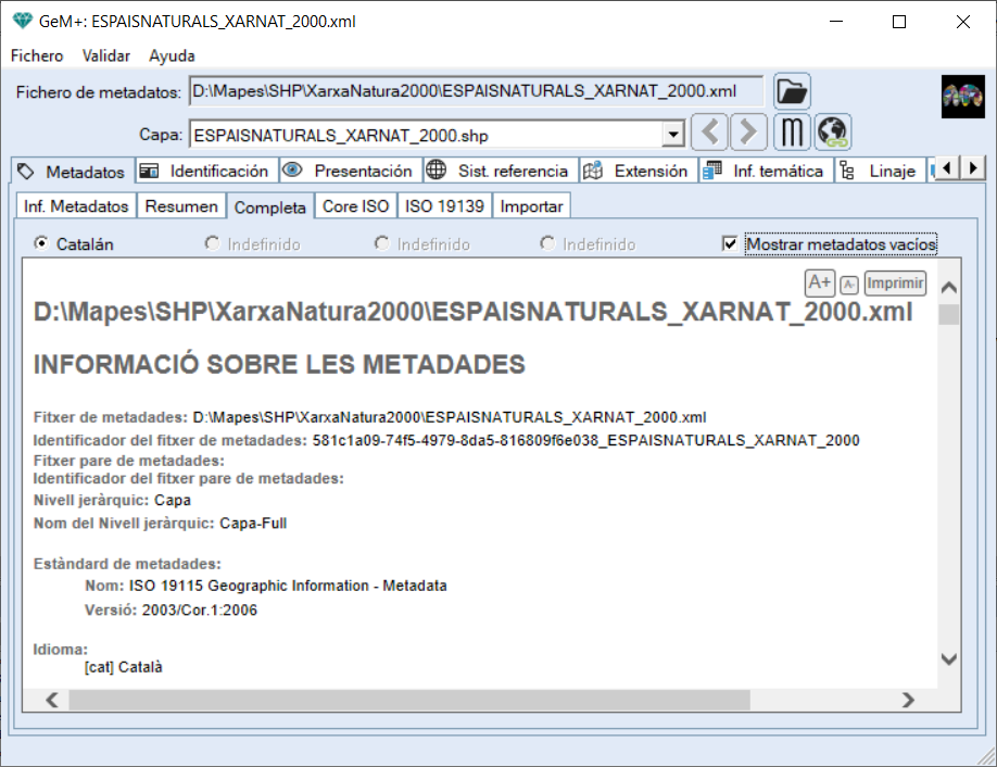 En la pestaña Completa se permite visualizar toda la información de los metadatos (sistema de referencia, aspectos técnicos, extensión geográfica, información temática de la capa) y al hacer clic en la opción Mostrar metadatos vacíos se muestran todos los campos que no se han completado.