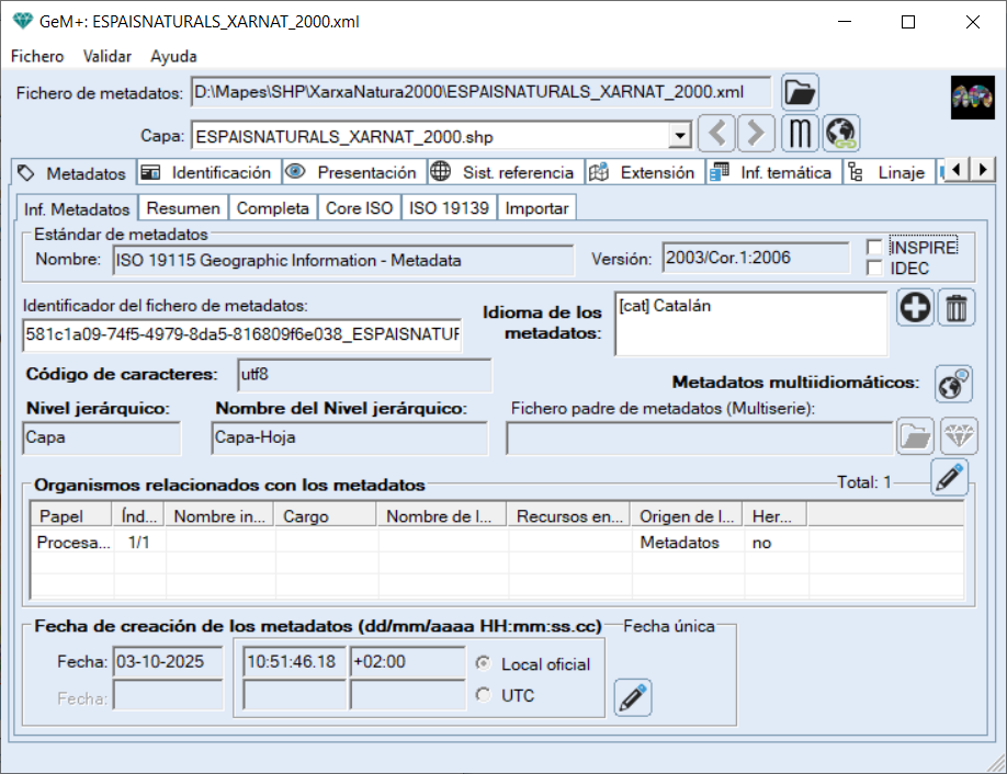 En la pestaña Información de Metadatos (Inf.Metadatos) también podemos ver en la siguiente figura los datos documentados automáticamente: el nombre y versión del estándar de metadatos, el identificador del fichero, código de caracteres y nivel jerárquico. Podemos editar la información sobre los campos: Organismos relacionados con los metadatos, la fecha de creación del metadato y establecer el idioma de los metadatos. Con el botón