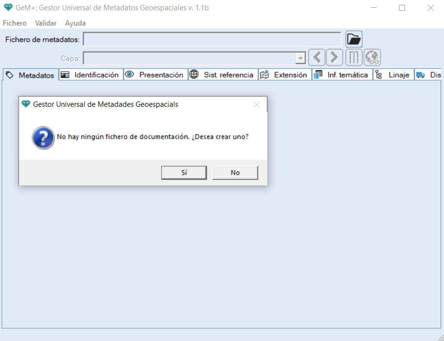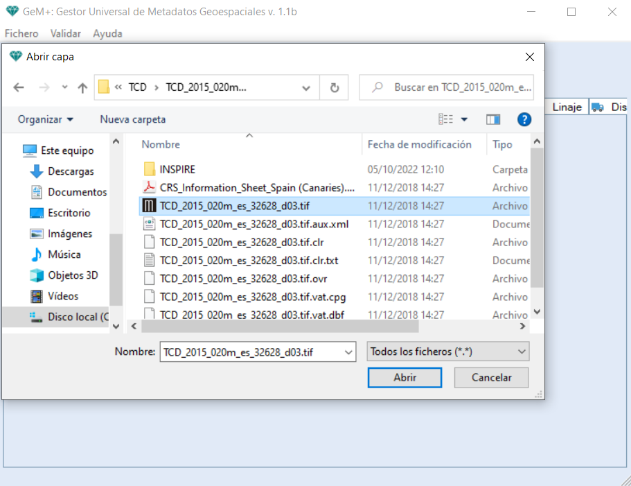 A partir de la opción del menú: "Fichero | Abrir" debe seleccionar el fichero de metadatos en formato REL, o bien el raster o vector que contiene los datos; en este caso GeM+ leerá de forma automática el REL que esté asociado o, si no existe, preguntará si desea crearlo automáticamente.