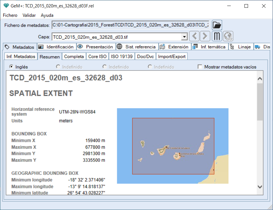 Cada una de las pestañas de GeM+ muestra la información sobre una de las secciones de los metadatos.