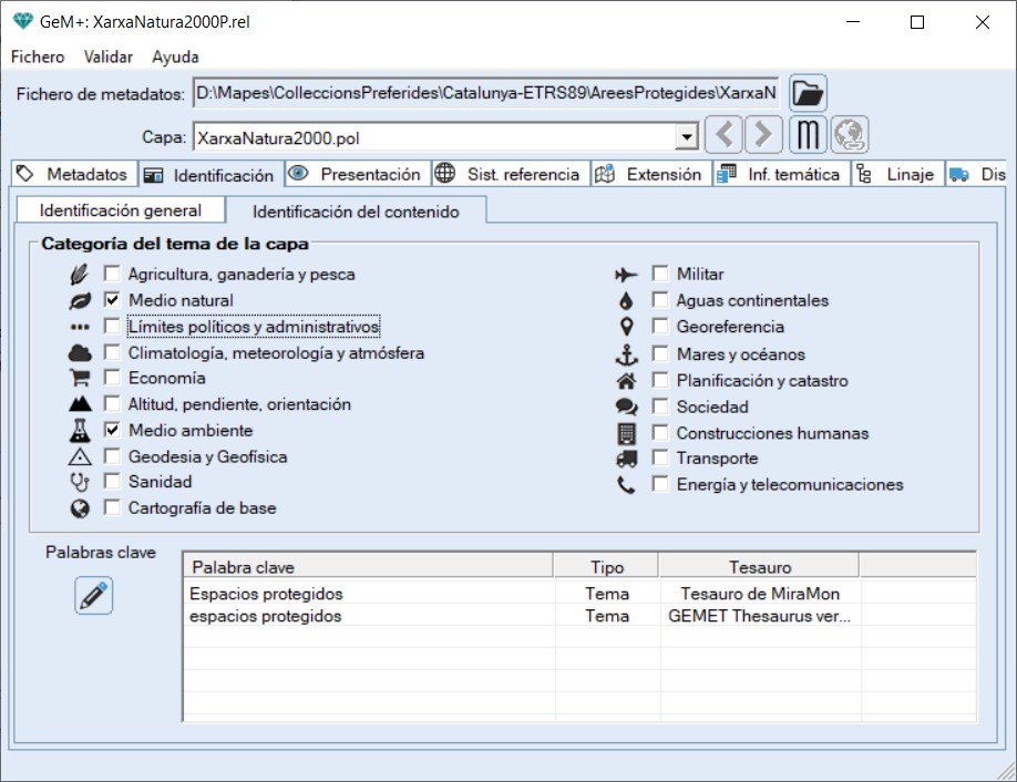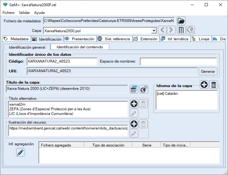 La pestaña de identificación recoge los metadatos que permiten identificar la base, se encuentra dividida en dos subpestañas: una con información más general y la otra que hace referencia al contenido. La información de identificación es obligatoria para la mayoría de estándares de metadatos, ya que esta información es la base que permite catalogar y buscar los datos.