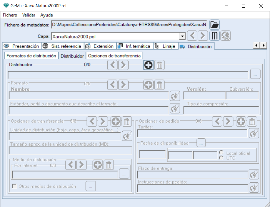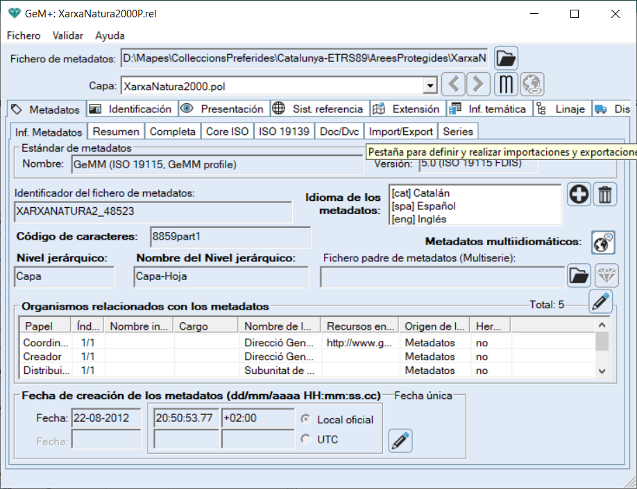 La pestaña de metadatos está formada por un subconjunto de pestañas que recogen la información referente a los metadatos (metadatos de los metadatos) y ofrecen diversas vistas generales de los metadatos en HTML y XML.