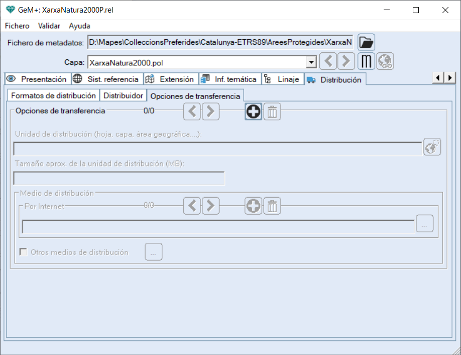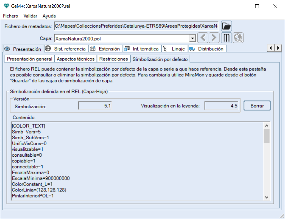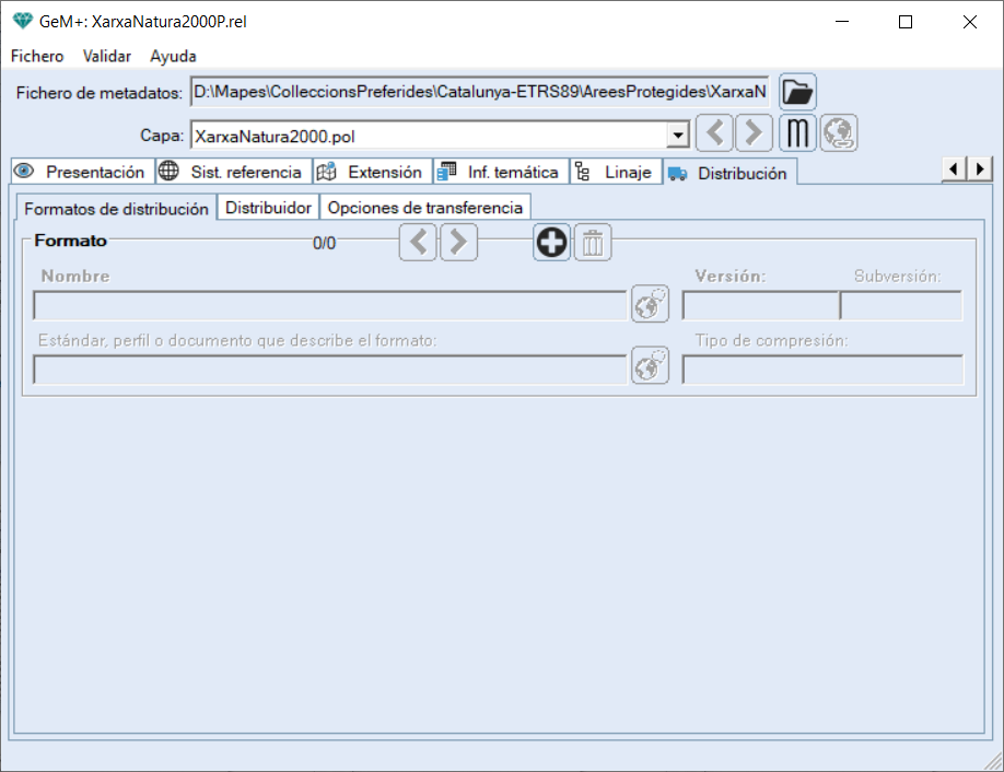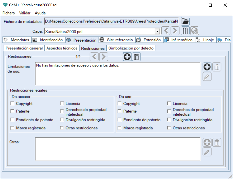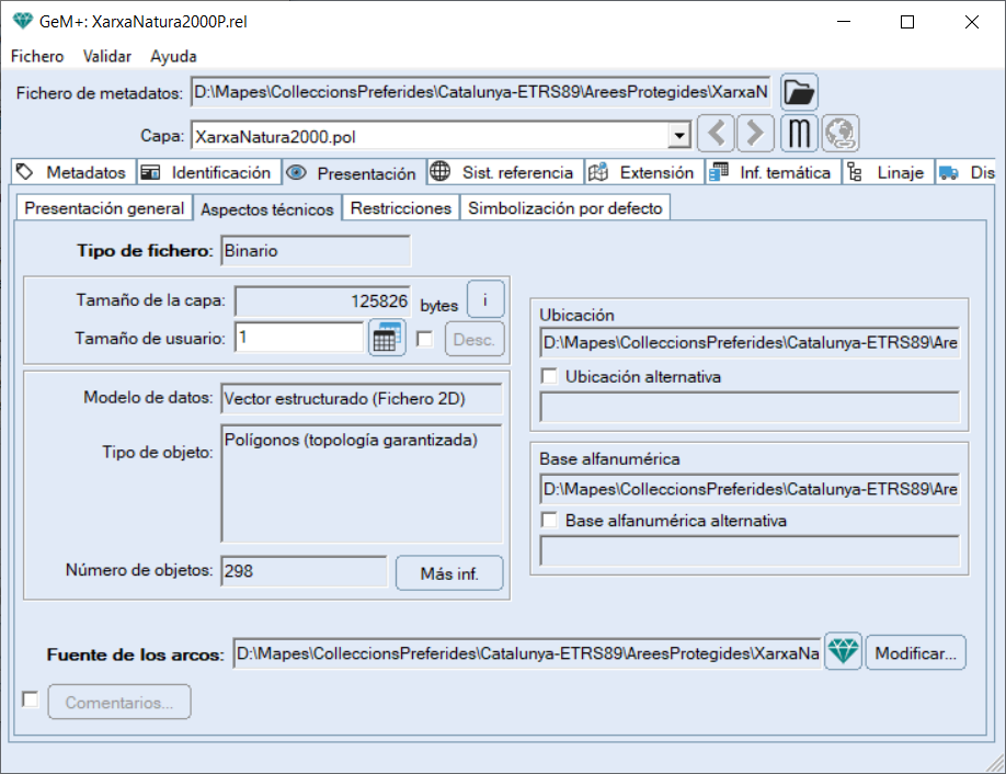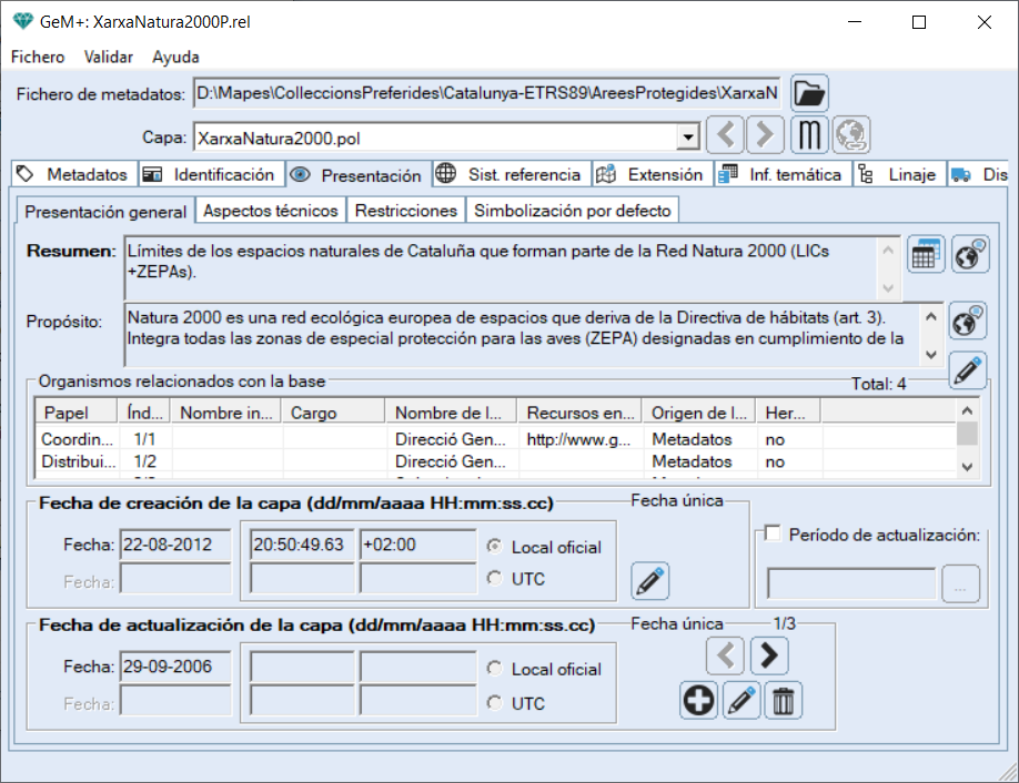 La pestaña de presentación recoge los metadatos que permiten comprender mejor el contenido de la base. Se compone de un conjunto de pestañas que permiten definir los metadatos más generales y otros aspectos más técnicos.