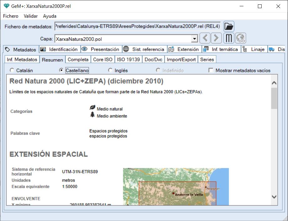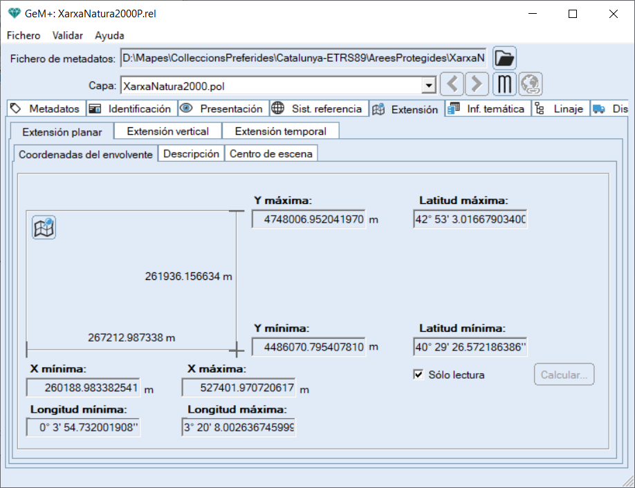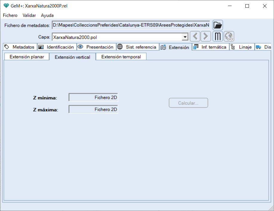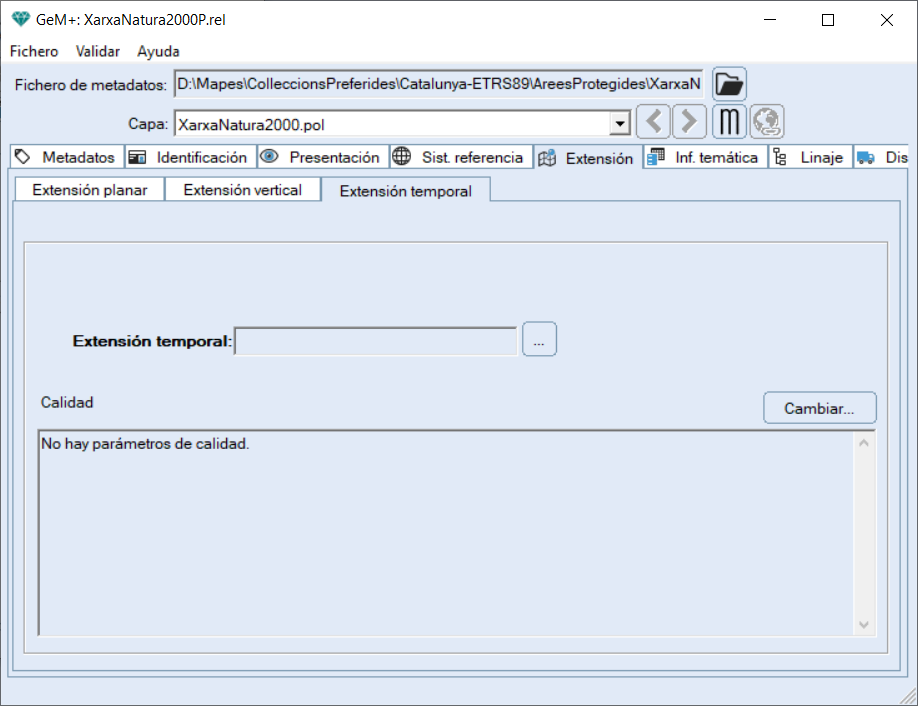La pestaña de extensión contiene los datos suficientes para informar sobre la extensión planar, vertical y temporal y su calidad.