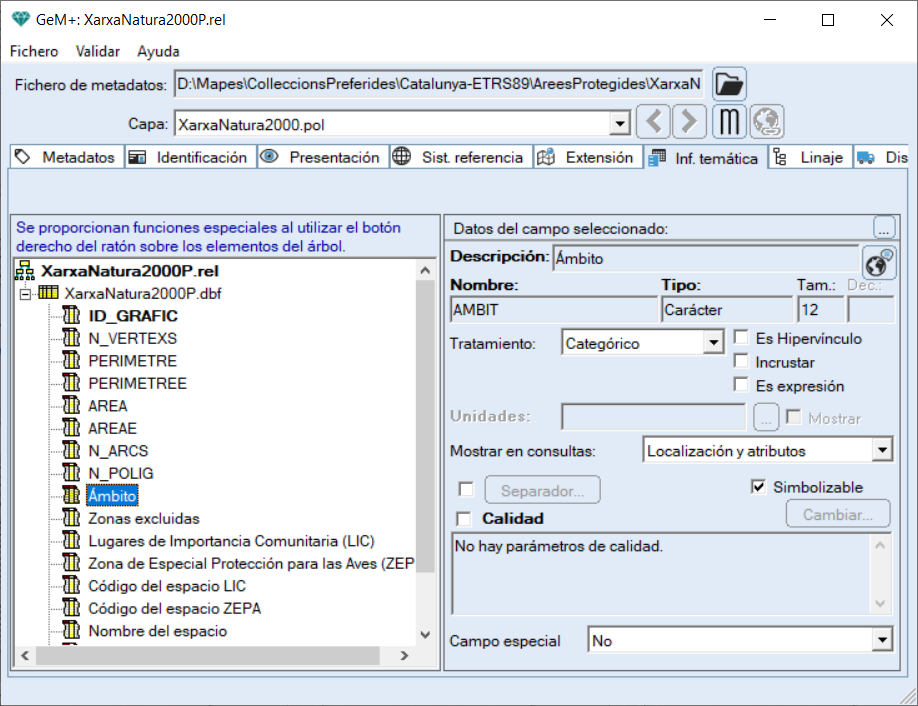 La pestaña de información temática recoge la información sobre los atributos temáticos asociados a la base y su calidad.