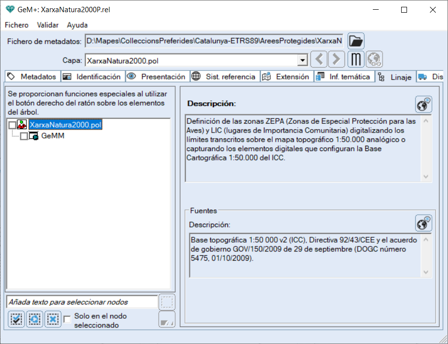 La pestaña de linaje recoge la información que describe la historia de la base en cuanto a la cartografía de referencia, los procesos que se han realizado y quién ha promovido estos procesos.