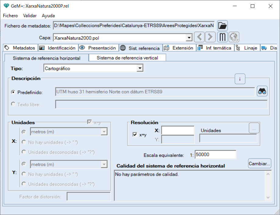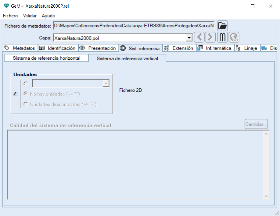 La pestaña del sistema de referencia espacial contiene información sobre el sistema de referencia de la base, básicamente sobre el sistema de referencia horizontal y su calidad.