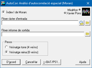 Aquesta aplicació permet quantificar el grau d'autocorrelació espacial d'una variable en un fitxer ràster mitjançat el càlcul d'un indicador, en aquest cas a través de l'índex I(i) de Moran.
