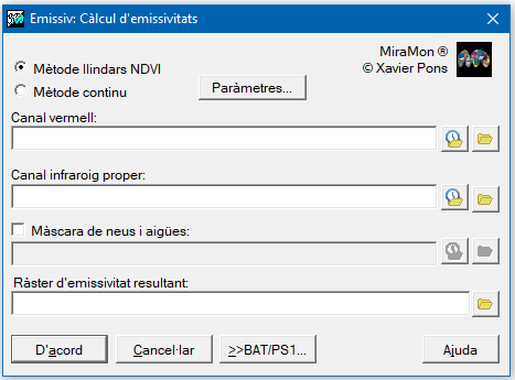 Aquesta aplicaciķ permet calcular l'emissivitat a partir d'una banda de la regiķ espectral del vermell i una de la regiķ espectral de l'infraroig. Es pot afegir una māscara per a les zones d'aigua i de neu, assignant valor "1" a les zones d'aigua i valor "2" a les de neu.