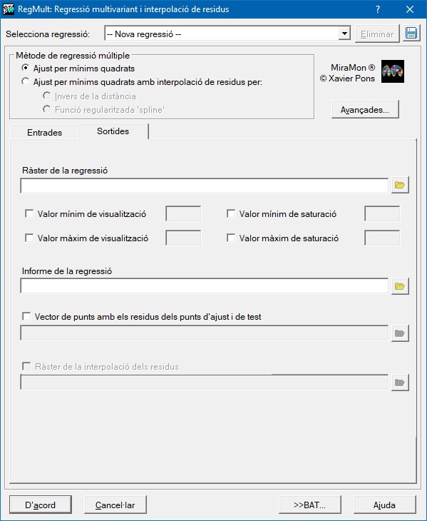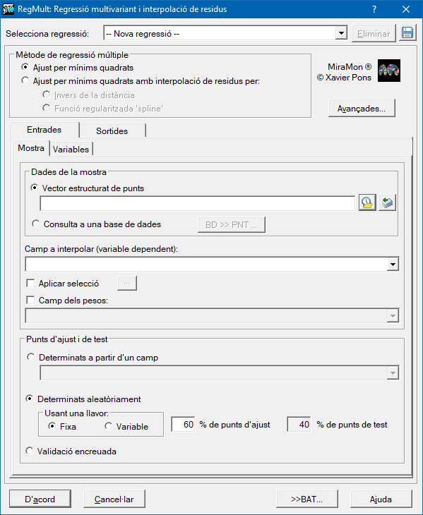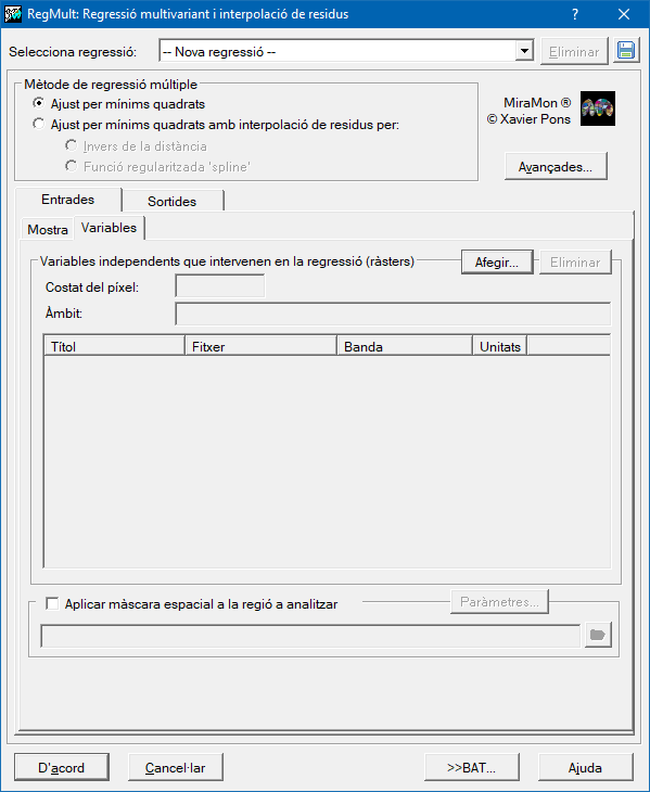 Per tal de determinar els coeficients de la regressió és necessari proporcionar un conjunt de mostres on és coneguda alhora la variable dependent en localitzacions concretes (puntuals) i el conjunt de les possibles variables independents. Aquestes mostres es proporcionaran o bé en un fitxer de punts estructurat PNT, o en una taula en format DBF, o bé en una taula en qualsevol altre format accessibles mitjançant un driver ODBC (Open DataBase Connectivity). Les variables independents caldrà proporcionar-les com a ràsters en format IMG del mateix àmbit geogràfic i costat de píxel. El resultat predictiu serà també un ràster en format IMG.