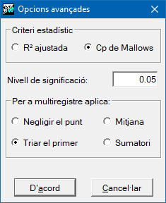 Durant el procediment de selecció de la regressió òptima, l'aplicació informa dels paràmetres estadístics de la regressió amb totes les variables independents introduïdes i dels paràmetres estadístics de la regressió seleccionada (evidentment només si les dues solucions no són la mateixa) i així poder avaluar com millora la regressió seleccionada en eliminar alguna variable que s'ha detectat que és poc significativa.